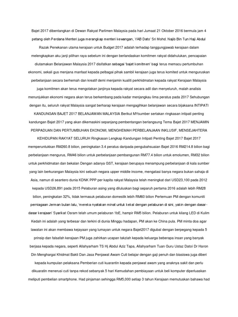 Perdana menteri, datuk seri najib tun razak bakal mempengerusikan mesyuarat jawatankuasa dasar fiskal, khusus untuk pengubahsuaian bajet, bulan ini. Intipati isi pembentangan bajet 2017 malaysia. Posted by mohamad aizuddin bin ismail at 8:53 am. Intipati bajet 2020 warga pendidikan. Krjn ambil keputusan melantik secara kontrak kumpulan pertama graduan perubatan,pergigian dan farmasi selewat2 disember 2016.