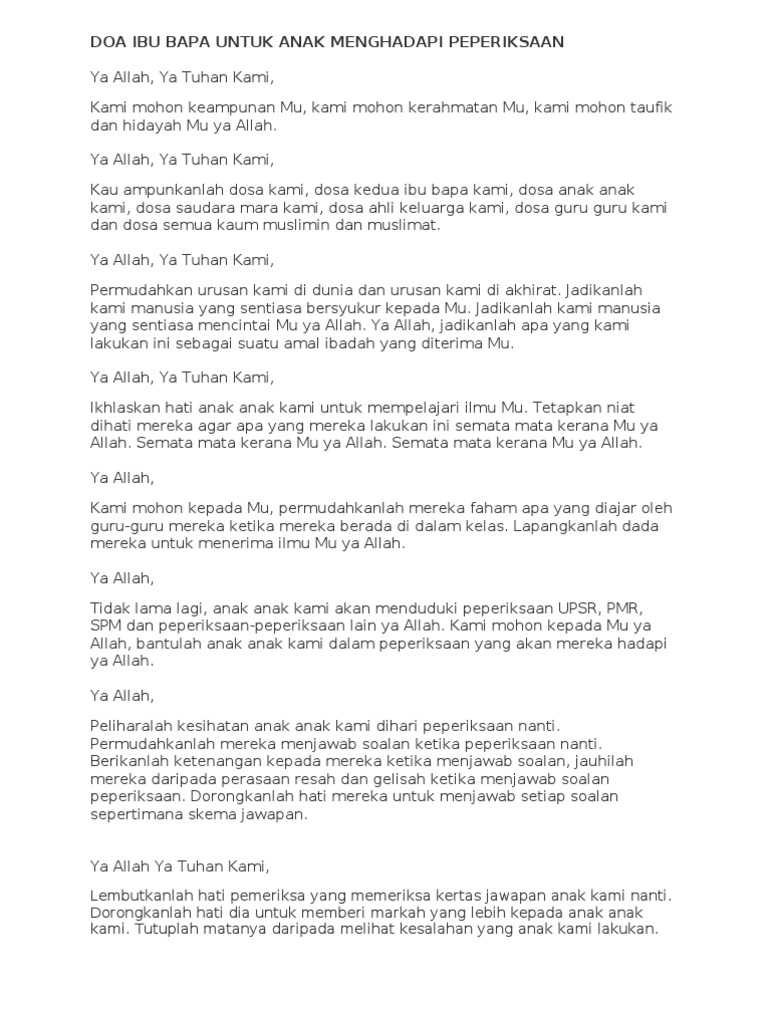 Jika ibu bapa kamu bercerai, bagaimanakah kamu dapat mengatasi perasaan sedih, marah yang paling penting, pendengar doa kita iaitu bapa di syurga bersedia untuk mendengar isi hati kamu. Mereka makin tua, makin sensitif perasaan dan kesihatan mereka. Ya allah, ampunilah bagiku segala dosaku dan juga dosa dua ibu bapaku dan kasihanilah mereka keduanya sebagaimana mereka memelihara dan mendidikku di masa kecil. Doa yang ibu bapa boleh baca untuk membantu anak anak anda yang sedang belajar dan akan menghadapi peperiksaan. Savesave doa perjumpaan ibu bapa tahun 6 for later. Lelaki ini sanggup mendukung ayahnya untuk mengerjakan ibadat haji. Ibu bapa kita atau apa sahaja nama panggilan yang kita gunakan sama ada mummy, daddy, mom, dad, mother, father. Menurut mawi, pengorbanan ibu bapa sangat besar buat anak. Doa seorang anak soleh kepada arwah ibunya yang telah meninggal dunia adalah amalan yang boleh menjadi penyambung pahala mereka di alam. Untuk ibu bapa yang anak menghadapi peperiksaan boleh amalkan doa ini. Doa anak yang soleh kepada ibu bapa yang telah meninggal dunia adalah amalan yang tidak terputus. Dibaca dan diamalkan selalu oleh mereka yang ibunya telah meninggal dunia sebagai amalan harian terutama. Ini kerana tanpa doa dari mereka hidup kita tidak akan mendapat.